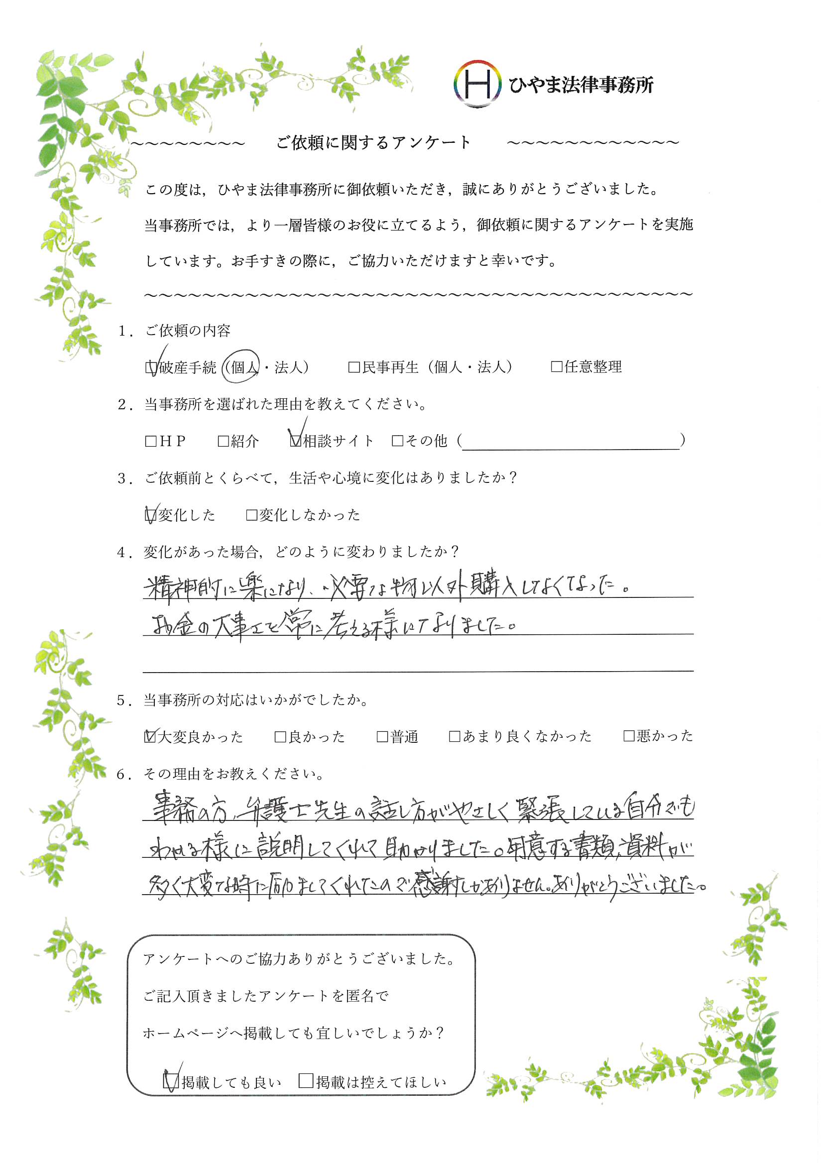 そんな中、ひやま法律事務所に相談させていただく機会があり快く受けてくださったことにとても感謝しています。
