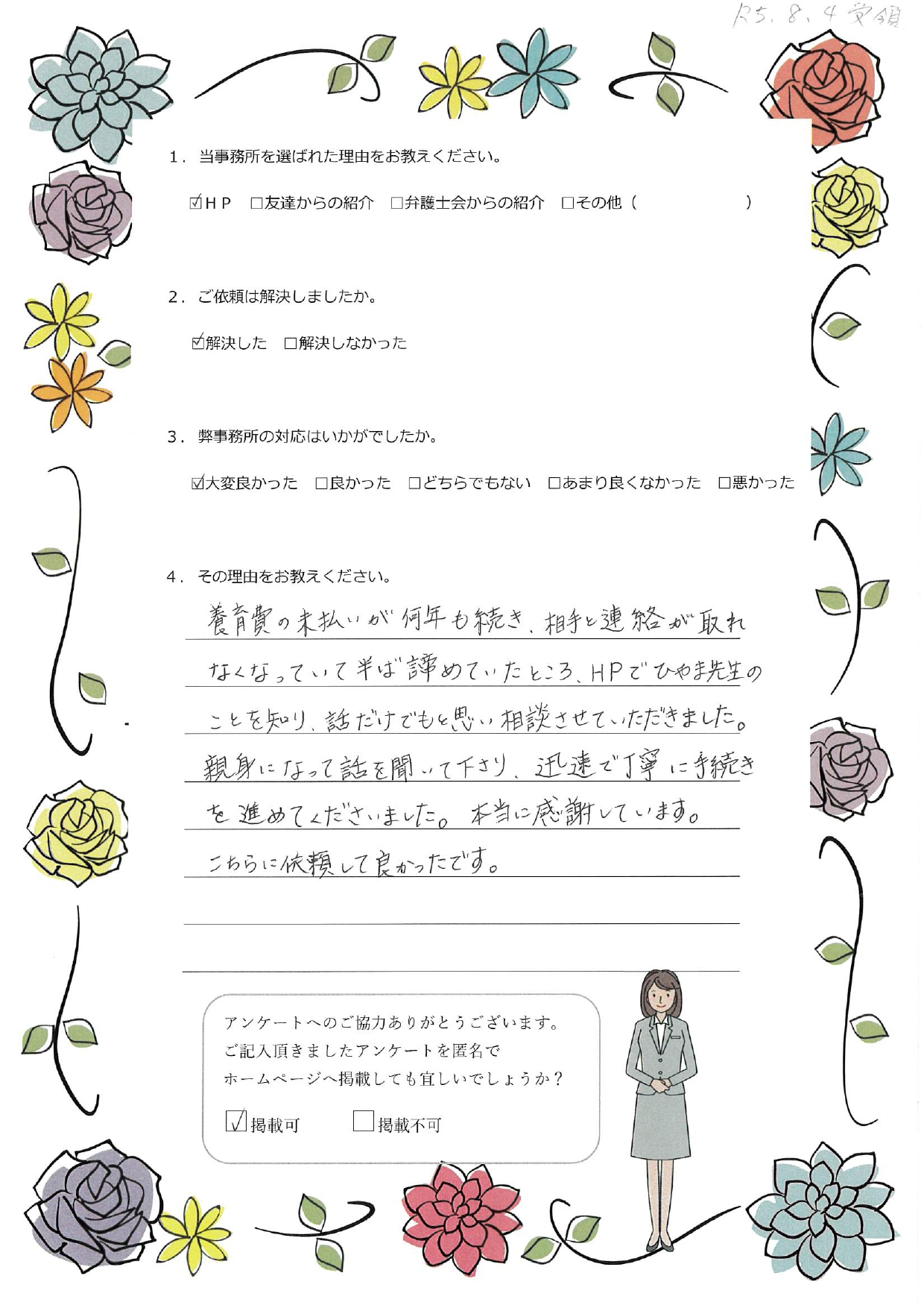 長い間、取る事が出来なく(養育費)を解決となり安心しました。