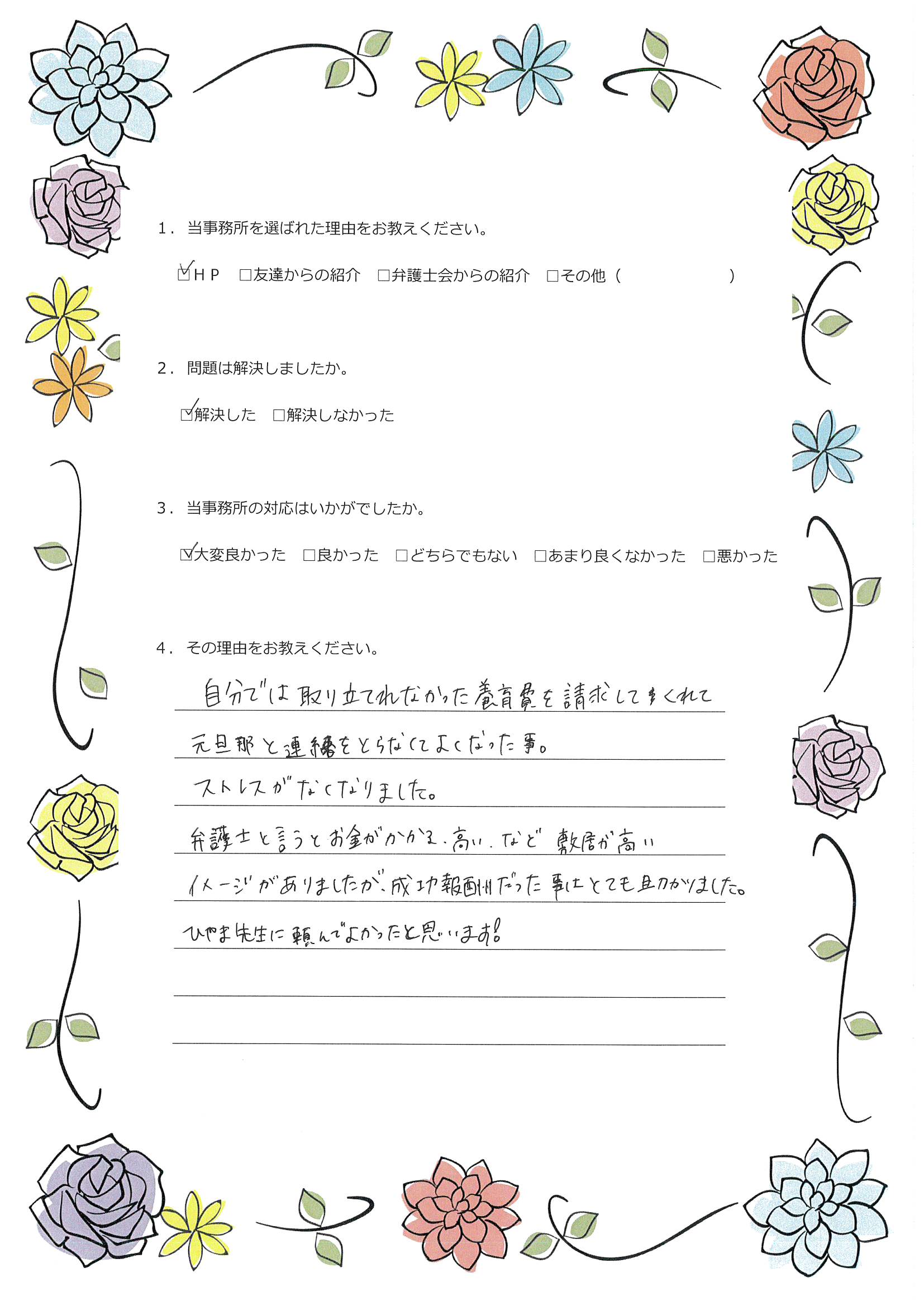 ひやま先生はよくよ~く話を聞いて下さり、「とことんやりましょう!!」とあの手この手でいろいろ明らかにして下さり、今は遡って養育費を支払ってもらうことができています。