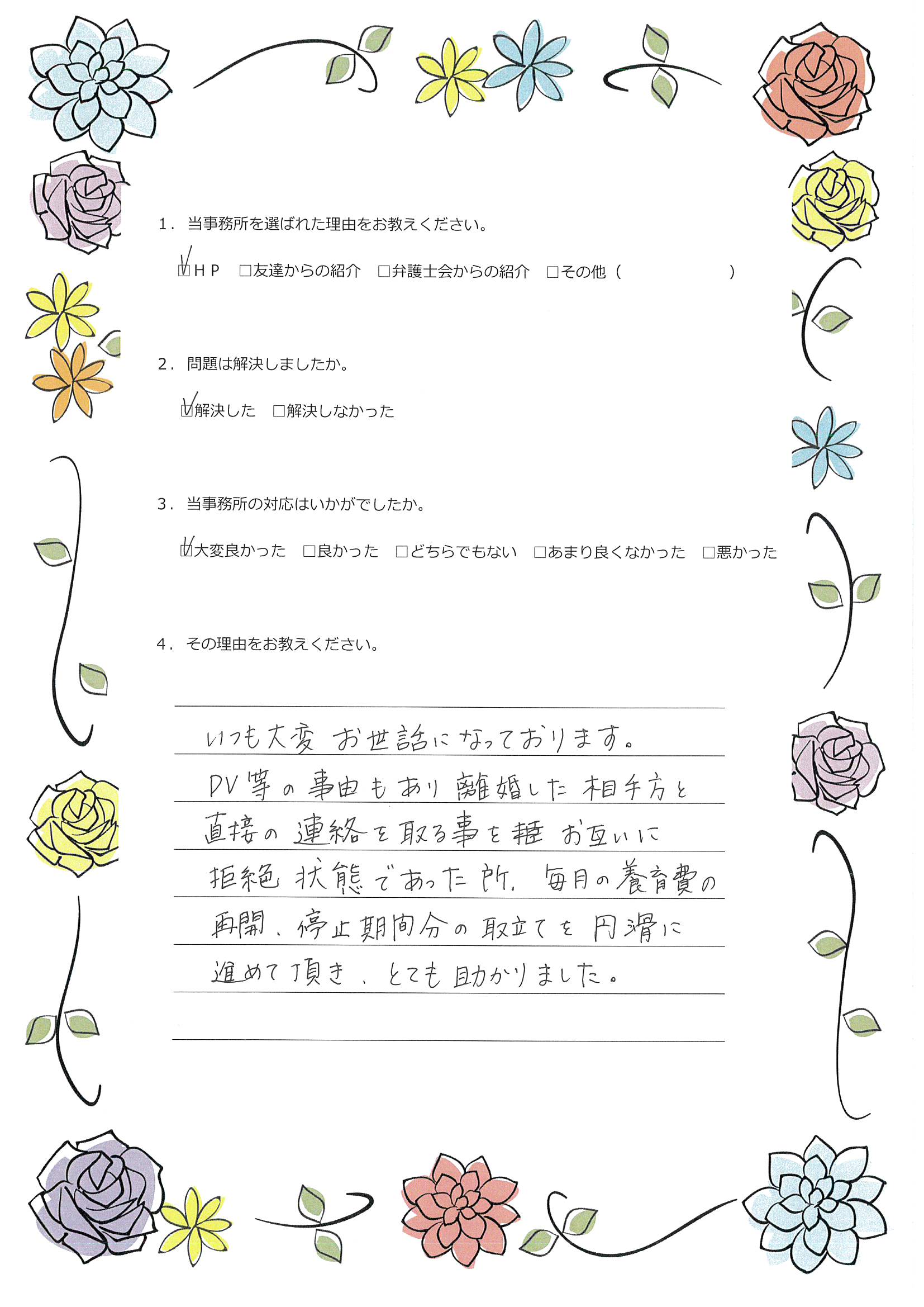 DVなどの事由もあり離婚した相手方と直接の連絡を取る事をお互いに拒絶状態であった所、毎月の養育費の再開、停止期間分の取立てを円滑に進めて頂き、とても助かりました。
