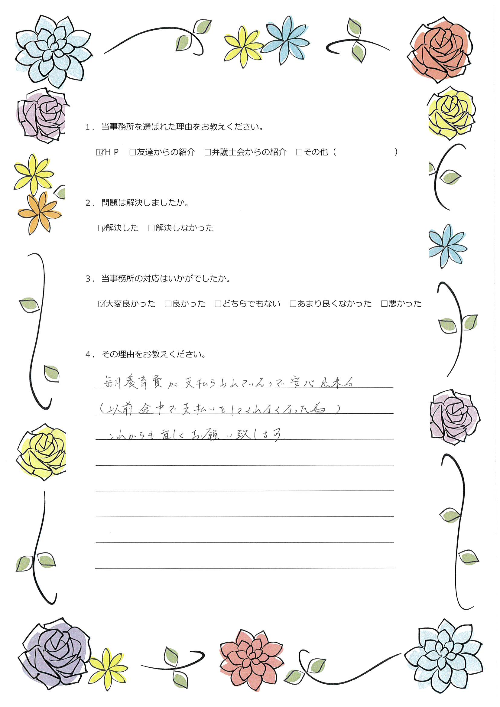- 自身で財産開示命令の手続と途中まで行いましたが、継続して養育費を支払ってもらう事は考えていなかったので、先生にお願いして良かったと思います。