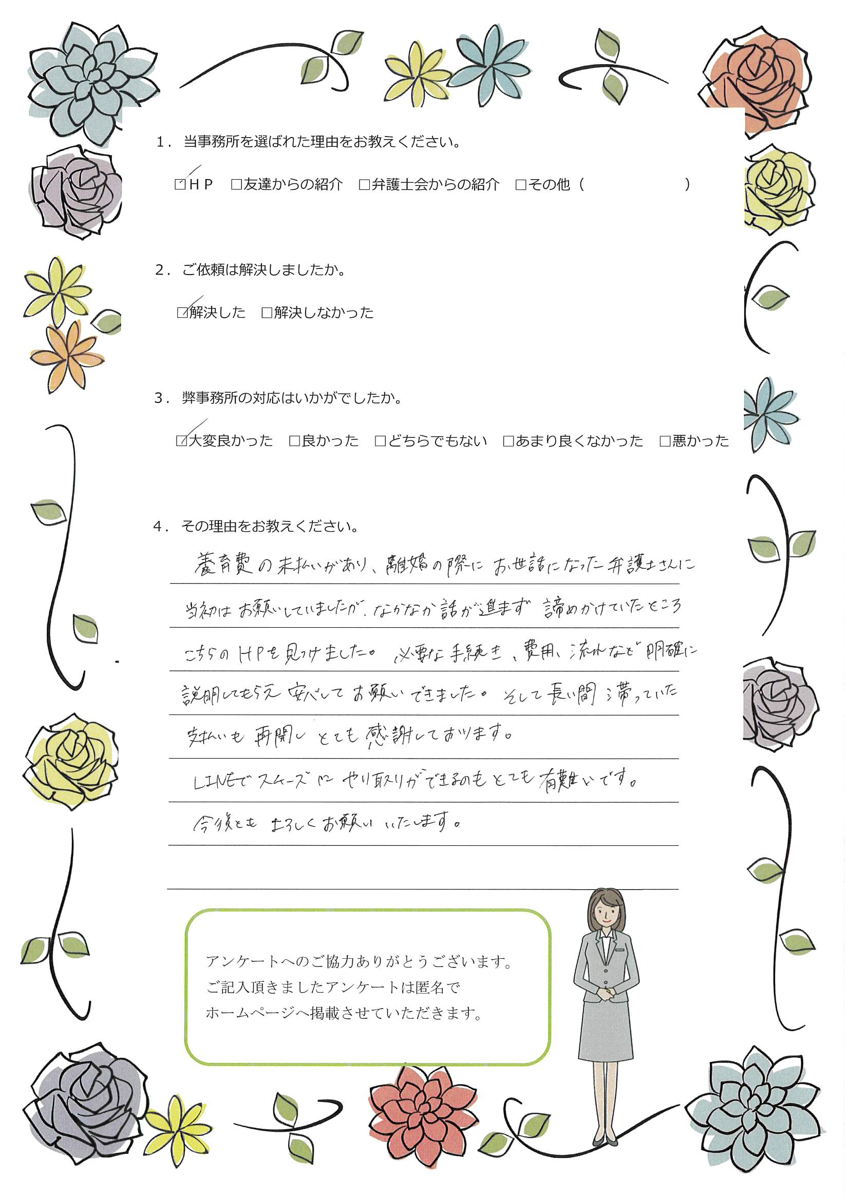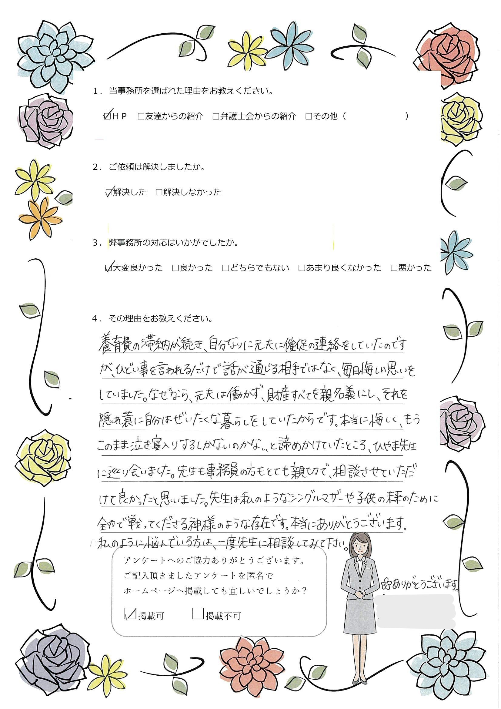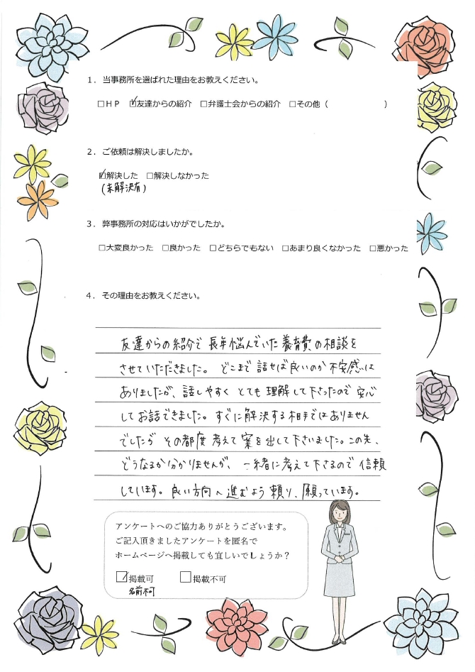 - 友達からの紹介で長年悩んでいた養育費の相談をさせていただきました。