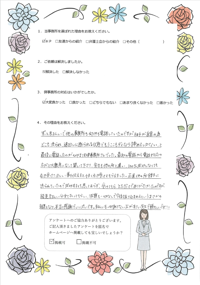 - ずっと未払いで他の事務所も何件も電話していたのですが、相手が自営の為どこも渋られ、遠回しに断られる状態で、もうここもダメなら諦めるしかない、と最後に電話したのが、ひやま法律事務所さんでした。